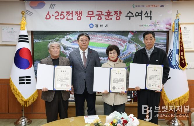 브릿지저널 김경미 기자 | 김해시는 10일, 6·25전쟁에 참전하여 혁혁한 전공을 세웠음에도 전후 혼란한 상황으로 인해 그동안 훈장을 받지 못했던 故김성수 하사, 故김동준상병, 故유경춘 상병 유족에게 국방부장관을 대신해 화랑무공훈장을 전수했다.
