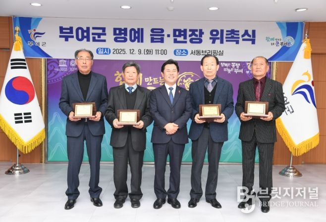 브릿지저널 정보영 기자 | 부여군은 부여군청 서동브리핑실에서 ‘2025년 부여군 명예 읍·면장 위촉식’을 개최하고, 지역사회에서 신망을 얻고 있는 인사 4명을 신임 명예 읍·면장으로 위촉했다고 11일 밝혔다.