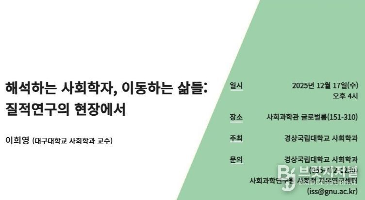 브릿지저널 김경미 기자 | 경상국립대학교 사회과학연구원 사회적 치유연구센터(센터장 김명희 사회학과 교수)는 12월 17일 오후 4시 가좌캠퍼스 사회과학관 글로벌룸(151동 310호)에서 대구대학교 사회학과 이희영 교수를 초청하여 ‘해석하는 사회학자, 이동하는 삶들: 질적연구의 현장에서’라는 주제로 특강을 개최한다.