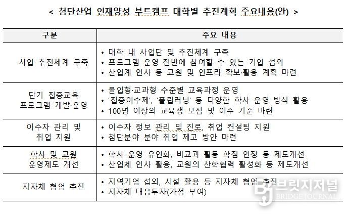 브릿지저널 김경미 기자 | 교육부와 한국산업기술진흥원(원장 민병주)은 12월 11일에 ‘2026년 첨단산업 인재양성 부트캠프’ 운영계획을 발표하고, 공고를 통해 참여대학을 모집한다.
