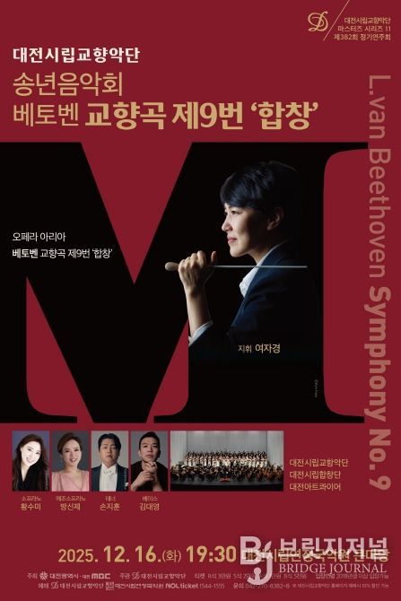 브릿지저널 정보영 기자 | 대전시립교향악단은 2025년 16일 저녁 7시 30분, 대전시립연정국악원 큰마당에서 마스터즈시리즈 11 송년음악회 베토벤 교향곡 제9번 ‘합창’을 무대에 올린다.