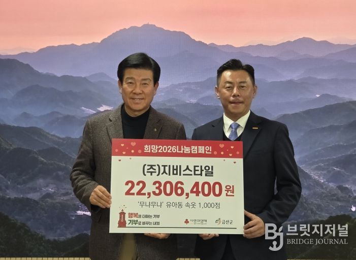 브릿지저널 정보영 기자 | 유아동 의류 전문 브랜드 ㈜지비스타일(본부장 김동희)은 지난 11일 금산군청을 방문해 약 2230만 원 상당 유아동 내의 1000점을 기탁하며 지역 아동을 위한 따뜻한 나눔을 실천했다.