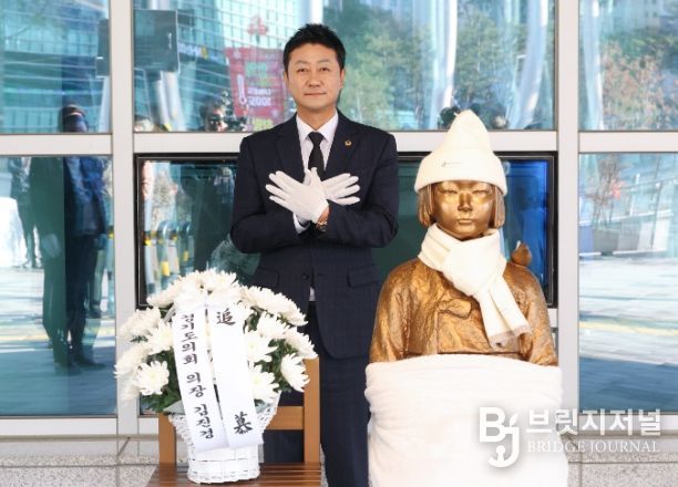 브릿지저널 김경미 기자 | 김진경 경기도의회 의장(더민주, 시흥3)은 12일 오전 도의회 1층 입구에서 열린 ‘평화의 소녀상’ 7주년 추모식에 참석해 피해자들의 희생을 기렸다.