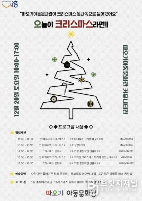 브릿지저널 김경미 기자 | 시흥시 따오기아동문화관이 오는 12월 20일 크리스마스 문화행사 ‘오늘이 크리스마스라면’을 연다. 반짝이는 트리, 서늘한 겨울 공기, 책장을 넘기는 소리가 한데 어우러지며 문화관은 잠시 ‘이야기가 살아 움직이는 공간’으로 변한다.