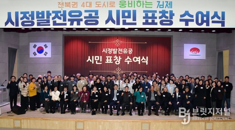 브릿지저널 윤나영 기자 | 김제시는 15일 한해 시정 발전을 위해 기여한 각계 분야 유공시민 및 가족 등 150여 명이 참석한 가운데 「 2025년 시정발전 유공시민 표창 수여식 」 을 가졌다고 밝혔다.