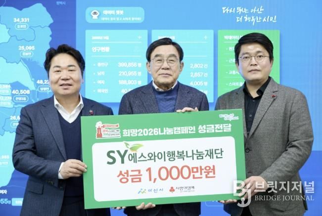 브릿지저널 정보영 기자 | 에스와이행복나눔재단이 15일 아산시에 방문해 ‘희망2026나눔캠페인’ 성금 1,000만 원을 기탁했다.
