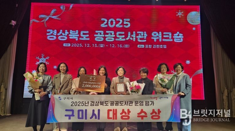 브릿지저널 정보영 기자 | 구미시는 지난 15일 열린 ‘2025 경상북도 공공도서관 워크숍’ 내 ‘공공도서관 운영평가 시상식’에서 도내 43개 공공도서관 중 전체 1위를 차지했다. 그룹별 평가에서도 구미시립중앙도서관이 A그룹 대상을, 구미도시공사 소속 봉곡도서관이 B그룹 우수상을 받으며 2년 연속 두 개관이 동시에 수상하는 성과를 거두었다.