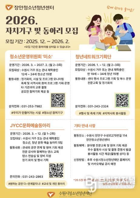 브릿지저널 김경미 기자 | 수원시청소년청년재단 장안청소년청년센터는 2025년 12월 16일부터 청소년 수련시설 및 지역사회의 변화를 이끌어갈 청소년과 청년 지원자를 모집한다.