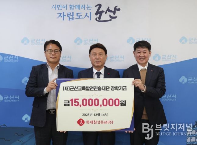 브릿지저널 윤나영 기자 | 롯데칠성음료(주)(대표 박윤기)는 16일 군산시청을 찾아 지역의 교육 발전을 위해 써달라며 장학금 1,500만 원을 군산교육발전진흥재단에 기탁했다.