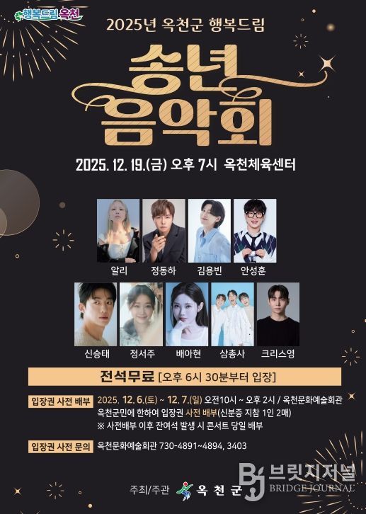 브릿지저널 김경미 기자 | 옥천군이 군민들을 위해 ‘2025년 옥천군 행복드림 송년음악회’를 오는 19일 옥천체육센터에서 개최한다.