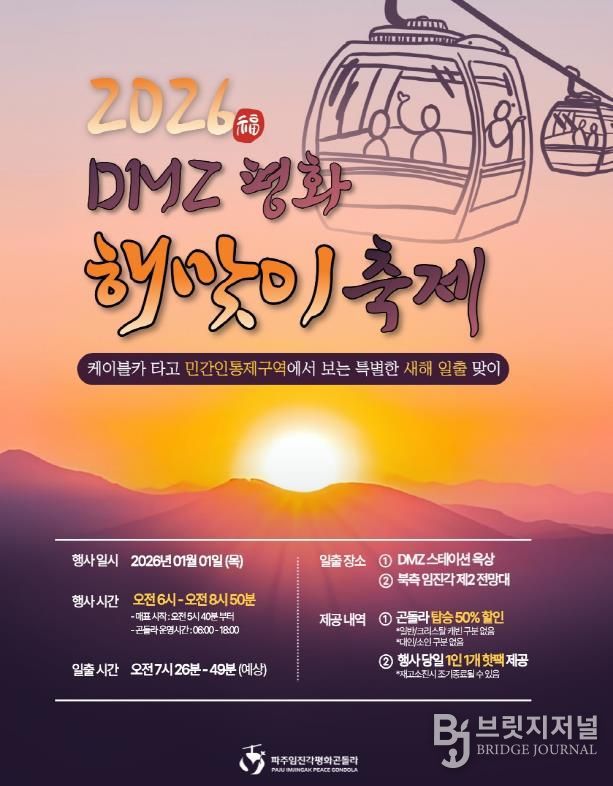 브릿지저널 김경미 기자 | 파주시는 2026년 1월 1일 새해 첫날, 파주임진각평화곤돌라에서 임진강과 디엠제트 일대를 조망하며 새해 소망을 기원하는 녪디엠지 평화 해맞이 축제’를 진행한다고 밝혔다.
