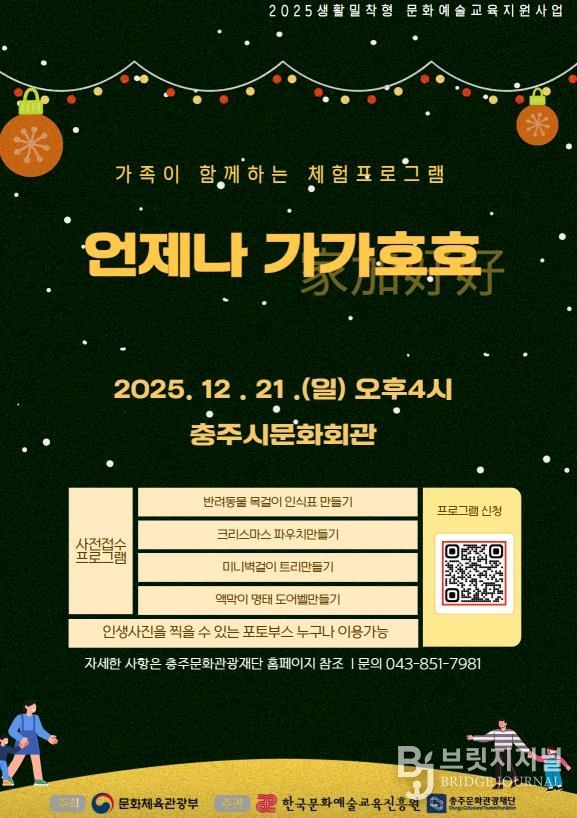 브릿지저널 김경미 기자 | 충주문화관광재단이 가족대상 연말 문화예술 교육프로그램 ‘언제나 가가호호(家加好好)’를 오는 12월 21일 오후 4시부터 충주시문화회관에서 개최한다.