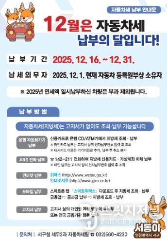 브릿지저널 김경미 기자 | 인천 서구는 2025년 12월 정기분 자동차세 15만 3천599건, 198억여 원을 부과하고 11일 고지서를 일괄 발송했다고 밝혔다.