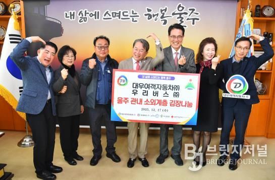 브릿지저널 윤나영 기자 | 대우여객자동차(주) 우리버스(주)가 17일 울주군 저소득층을 위해 김장김치 5㎏ 50개를 전달했다.