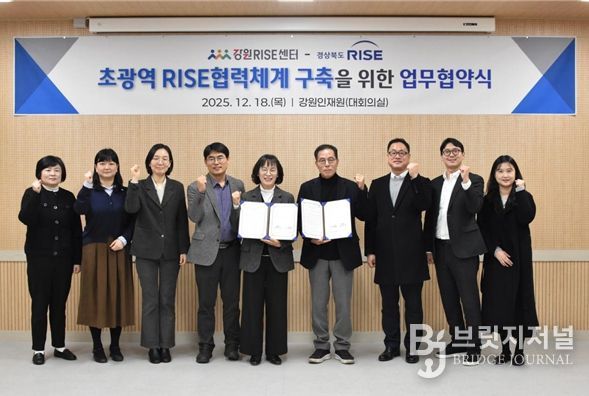 브릿지저널 윤나영 기자 | 강원라이즈(RISE)센터는 12월 18일 강원인재원 대회의실에서 경북라이즈센터와 ‘초광역 RISE협력체계 구축을 위한 업무협약’을 체결했다고 밝혔다.