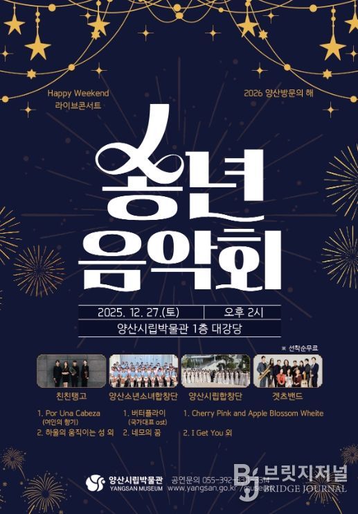 브릿지저널 김경미 기자 | 양산시립박물관은 다사다난했던 한해를 마무리하고 2026년을 희망차게 맞이하고자 오는 27일 오후 2시 시립박물관 대강당에서 ‘송년음악회’를 개최한다.