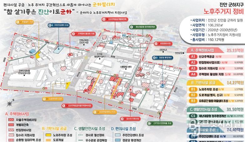 노후주거지 정비지원 사업에는 진안군 군하지구와 임실군 이도지구가 선정됐다. 진안군 군하지구는 ‘참 살기좋은 진안이로 군하’라는 비전으로 총사업비 135억원(국비 81억원)을 투입하여 노후 주거밀집지역을 대상으로 주택 정비와 도로·주차장 개선을 추진해 정주 여건을 높인다.