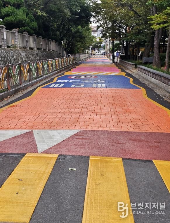 특히, 삼일초 인근 도로 618m 구간에는 분홍색과 노란색, 파란색 등 다양한 색상을 활용한 도막 포장을 적용해 운전자의 주의를 환기했다.