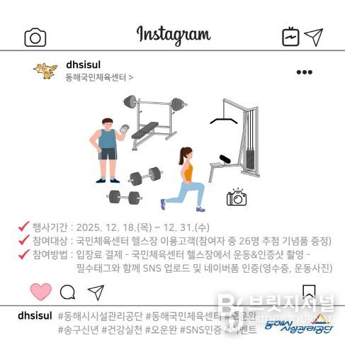 브릿지저널 윤나영 기자 | 동해시시설관리공단(이사장 이용빈)은 연말연시를 맞아 시민들의 건강관리 장려하고 헬스장 이용 활성화를 위해 '송구신년 건강실천 오운완 SNS 인증 이벤트'를 개최한다고 밝혔다.