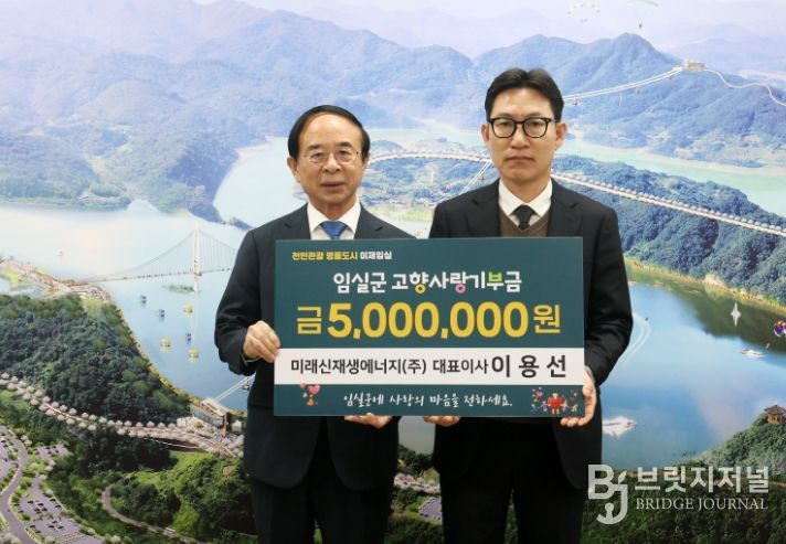 브릿지저널 윤나영 기자 | 임실군이 지난 15일 미래신재생에너지(주) 이용선 대표가 지역사회 발전과 주민 복리 증진을 위해 고향사랑기부금 500만원을 기탁했다고 밝혔다.