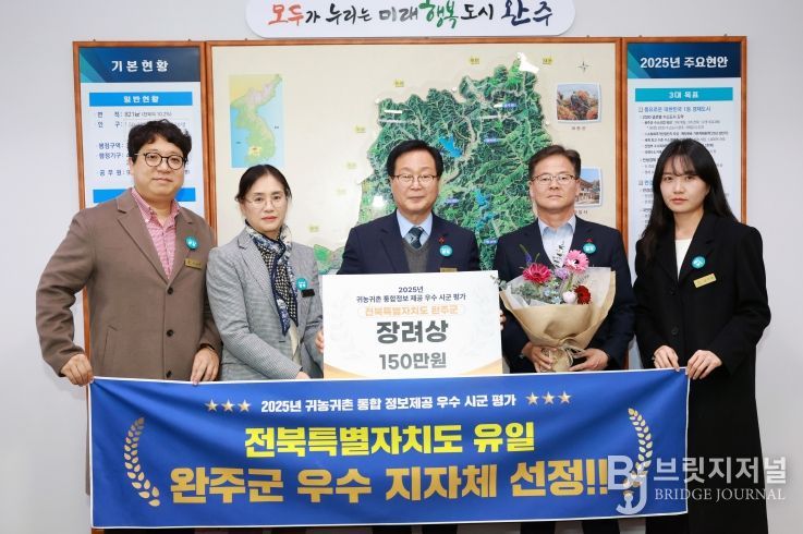 브릿지저널 윤나영 기자 | 완주군이 농림축산식품부가 주관한 ‘2025년 귀농귀촌 통합정보 제공 우수 시군 평가’에서 우수 지자체로 선정돼 장려상을 수상했다.
