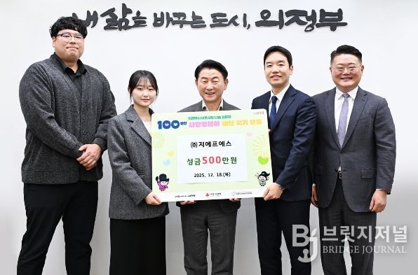 브릿지저널 김경미 기자 | 의정부시는 12월 18일 관내 기업 ㈜지에프에스가 지역사회 나눔 실천의 일환으로 성금 500만 원을 기탁했다고 밝혔다.