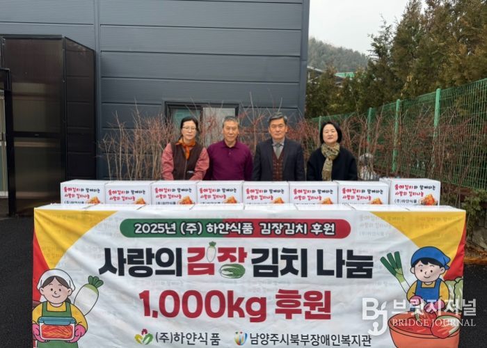 브릿지저널 김경미 기자 | 남양주시는 17일 남양주시북부장애인복지관에서 ㈜하얀식품(대표 장유라)의 후원으로 ‘사랑의 김장김치 전달식’을 개최하고, 지역 내 취약계층 장애인 가정에 김장김치 1,000kg을 개최했다고 밝혔다.