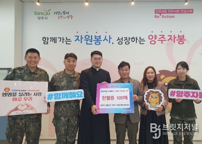 브릿지저널 김경미 기자 | 양주시자원봉사센터는 천주교 군종교구 오뚜기 성당(제8기동사단) 오형훈 군종신부와 군 장병들이 연말을 맞아 헌혈증 105장을 기부했다고 밝혔다.