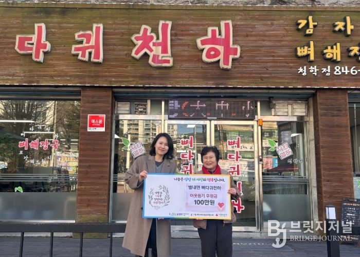 브릿지저널 김경미 기자 | 남양주시는 지난 18일 별내면 소재 ‘뼈다귀천하’가 지역 내 취약계층 지원을 위해 후원금 100만 원을 별내면 지역사회보장협의체에 기탁했다고 밝혔다.