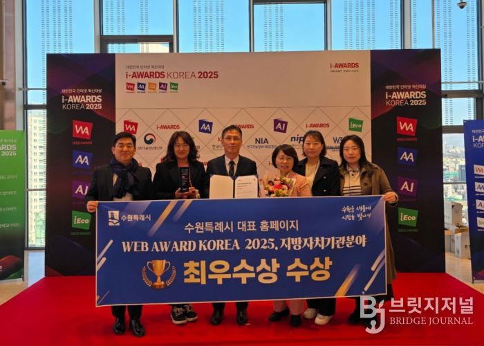 브릿지저널 김경미 기자 | 수원특례시가 한국인터넷전문가협회(KIPFA)가 주최한 ‘웹 어워드 코리아 2025’에서 지방자치기관분야 최우수상을 받았다. 시상식은 18일 양재 엘타워에서 열렸다.