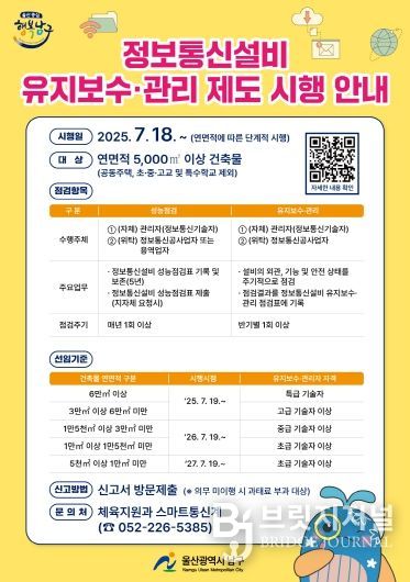 브릿지저널 윤나영 기자 | 울산 남구는 연면적 5,000㎡ 이상 건축물의 정보통신설비 유지보수‧관리자 선임을 의무화하는 ‘정보통신설비 유지보수‧관리 제도’를 지난 7월 19일부터 시행하고 있다고 밝혔다.