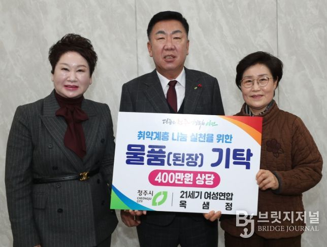 임시청사 직지실에서 진행된 기탁식에는 이범석 청주시장과 유현순 21세기여성연합 청주시지부 회장, 전순자 옥샘정 대표가 참석했다.