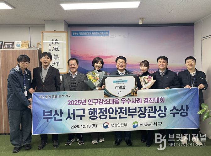 브릿지저널 윤나영 기자 | 부산광역시 서구는 지난 18일, 행정안전부에서 주최하는 ‘2025년 인구감소 대응 우수사례 경진대회’에서 행정안전부 장관상을 수상했다고 밝혔다.