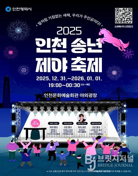 브릿지저널 김경미 기자 | 인천광역시는 오는 12월 31일, 한 해의 마무리와 새해의 시작을 시민과 함께 기념하기 위해 ‘2025 인천 송년제야 축제’를 인천문화예술회관 야외광장에서 개최한다고 밝혔다.