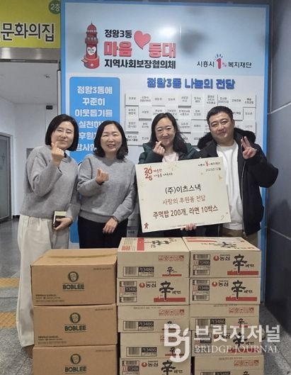브릿지저널 김경미 기자 | ㈜이츠스낵은 지난 12월 19일 정왕3동 지역사회보장협의체를 찾아 저소득 결식 우려 가구를 위한 주먹밥 200개와 라면 10상자를 전달했다.