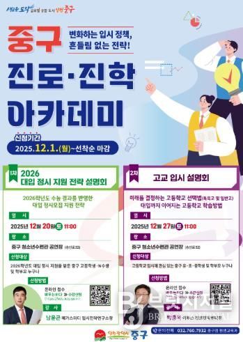 브릿지저널 김경미 기자 | 인천시 중구는 오는 27일 오전 11시 중구청소년수련관(송산로 52)에서 관내 학생과 학부모를 대상으로 ‘고교 입시 설명회’를 개최한다고 밝혔다.