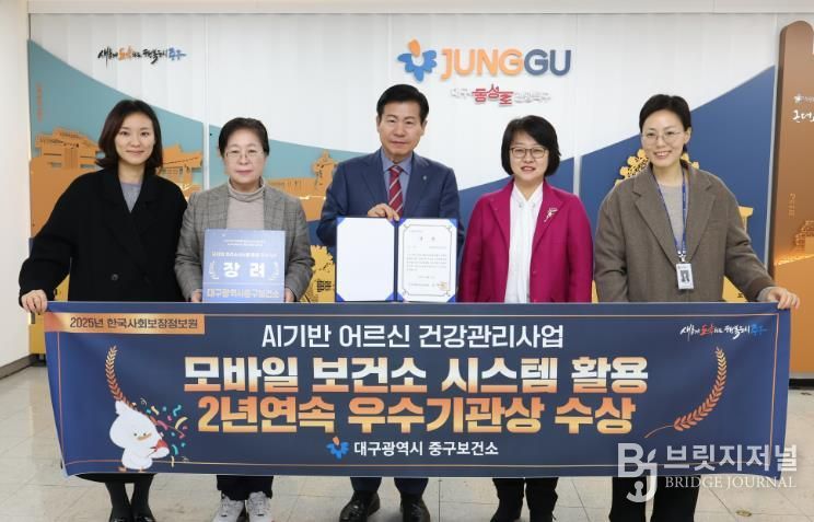 브릿지저널 김진석 기자 | 대구 중구보건소는 지난 18일 한국사회보장정보원이 주관한 ‘AI·IoT 기반 어르신 건강관리사업 모바일보건소 시스템 활용 평가’에서 2년 연속 장려상을 수상했다고 밝혔다.