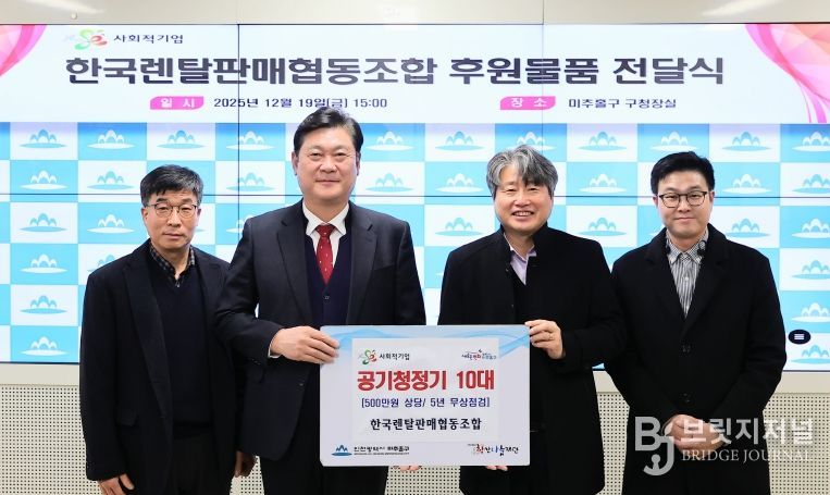 브릿지저널 김경미 기자 | 인천 미추홀구는 지난 19일 사회적기업 한국렌탈판매협동조합(대표 정영이)으로부터 공기청정기 10대를 전달받았다.