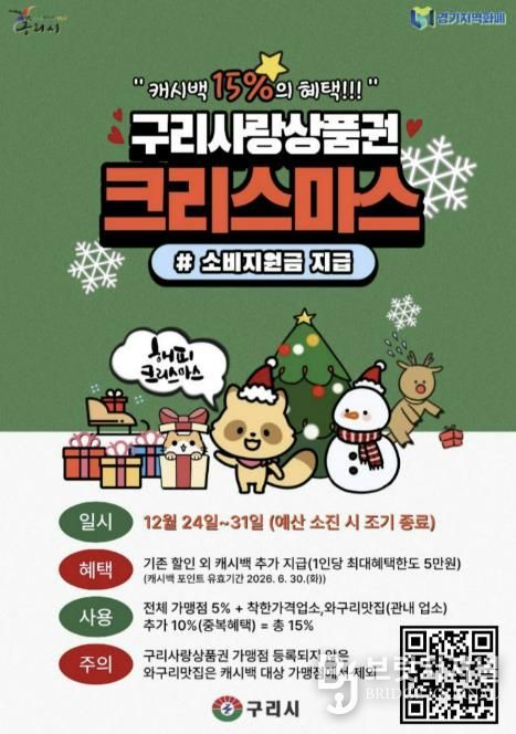 브릿지저널 김경미 기자 | 구리시는 12월 24일부터 ‘구리사랑상품권 크리스마스 소비 지원금’을 지급한다고 밝혔다. 이번 소비 지원금은 연말연시 기간 지역 외로 유출되는 소비를 지역 내로 유도하고, 관내 상권 활성화와 소상공인 보호를 위해 마련됐으며, 예산 소진 시 조기 종료될 수 있다.