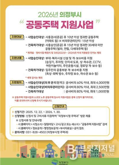 브릿지저널 김경미 기자 | 의정부시는 노후 공동주택의 관리비용 부담 완화와 주거환경 개선을 위해 내년 1월 30일까지 ‘2026년 공동주택 지원사업’ 신청을 받는다.