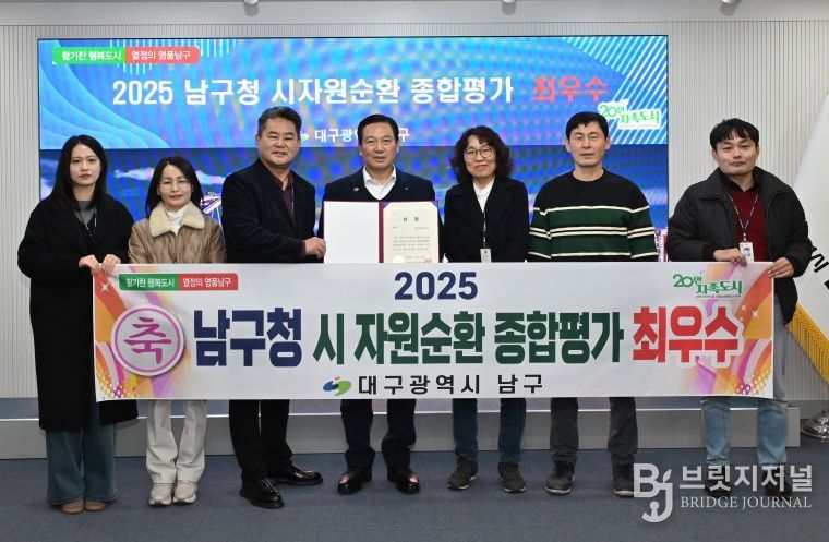 브릿지저널 김진석 기자 | 대구 남구는 2025 대구시 자원순환행정 종합평가에서 9개 구·군 가운데 ‘최우수’(1위)를 차지하며, 자원순환 선도 도시 명품 남구의 위엄을 알렸다.