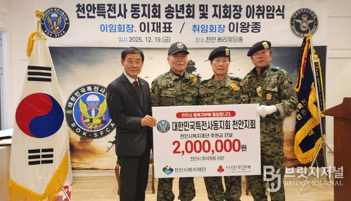 브릿지저널 정보영 기자 | (재)천안시복지재단은 지난 19일 대한민국 특전사동지회 천안지회가 송년의 밤 행사를 열고 취약계층을 위한 성금 200만 원을 기탁했다고 밝혔다.