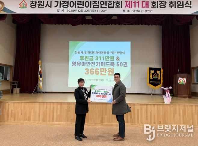 브릿지저널 김경미 기자 | 창원특례시는 창원시가정어린이집연합회에서 22일 개최된 제10·11대 회장 이취임식을 맞이하여 관내 학대피해아동을 지원하기 위한 후원금과 도서를 창원시아동보호전문기관에 전달했다고 밝혔다.