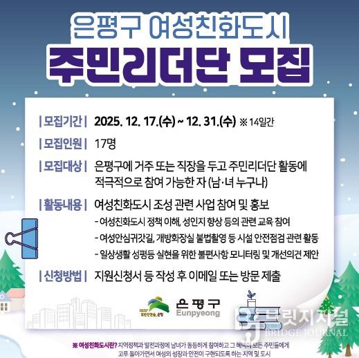 브릿지저널 김경미 기자 | 서울 은평구는 여성친화도시 조성을 위해 함께 할 ‘여성친화도시 주민리더단’ 단원을 새로 모집한다고 밝혔다.