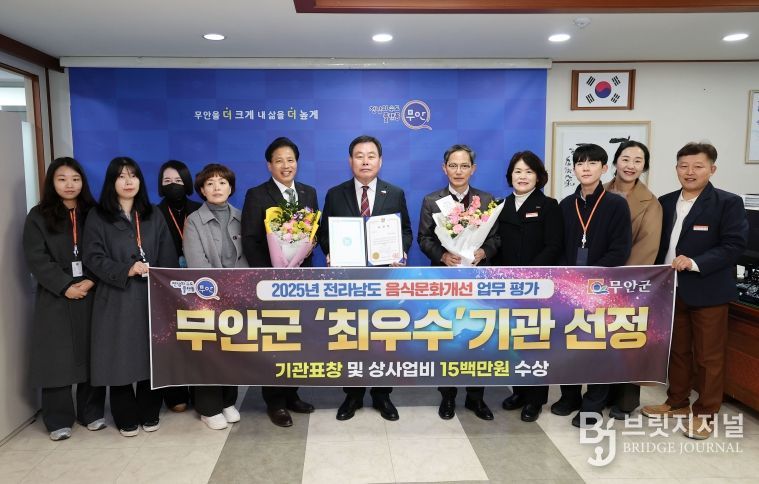 브릿지저널 김경미 기자 | 무안군은 전라남도 주관 2025년 음식문화개선 사업 평가에서 ‘최우수’ 기관으로 선정되어 기관 표창과 함께 상사업비 1천5백만 원을 확보했다.