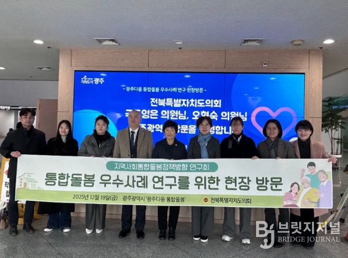 브릿지저널 윤나영 기자 | 전북특별자치도의회 ‘지역사회통합돌봄정책방향 연구회’(국주영은 대표의원)가 지난 18일 지역사회 통합돌봄 선도 모델로 평가받는 광주광역시 ‘광주다움 통합돌봄’ 현장을 방문해 사례 연구를 실시했다.