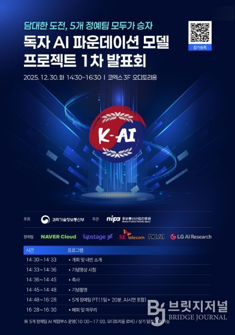 브릿지저널 김경미 기자 | 과학기술정보통신부와 정보통신산업진흥원(원장 박윤규)은 오는 12월 30일 14:30, 코엑스 오디토리움에서, 「독자 AI 파운데이션 모델」 프로젝트 1차 발표회를 개최한다.
