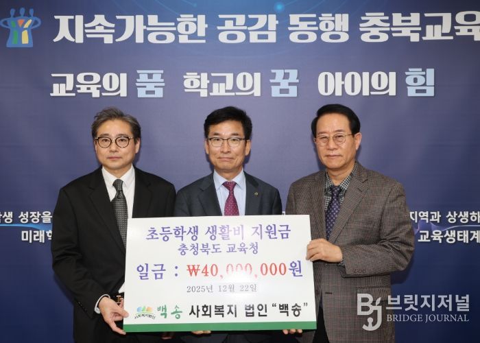 브릿지저널 김경미 기자 | 충청북도교육청은 22일 오전, 사회복지법인 백송(이사장 송승헌)과 교육감 집무실에서 초등학생 생활지원금 전달식을 가졌다고 밝혔다.