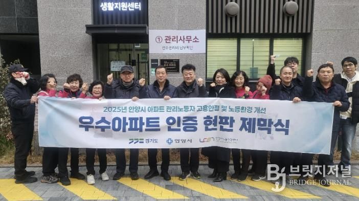 브릿지저널 김경미 기자 | 안양시노동인권센터는 지난 20일 ‘2025년 고용안정 및 노동환경 개선 우수아파트’로 선정된 래미안안양메가트리아와 힐스테이트인덕원역베르텍스 아파트에서 ‘우수아파트 인증 현판식’을 진행했다고 23일 밝혔다.