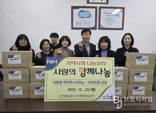 브릿지저널 김경미 기자 | 의왕농협 주부대학총동문회는 12월 22일, 회원들의 뜻을 모아 떡국떡 400kg(280만원 상당)을 부곡동주민센터에 기탁하며 어려운 이웃을 위한 나눔을 실천했다.